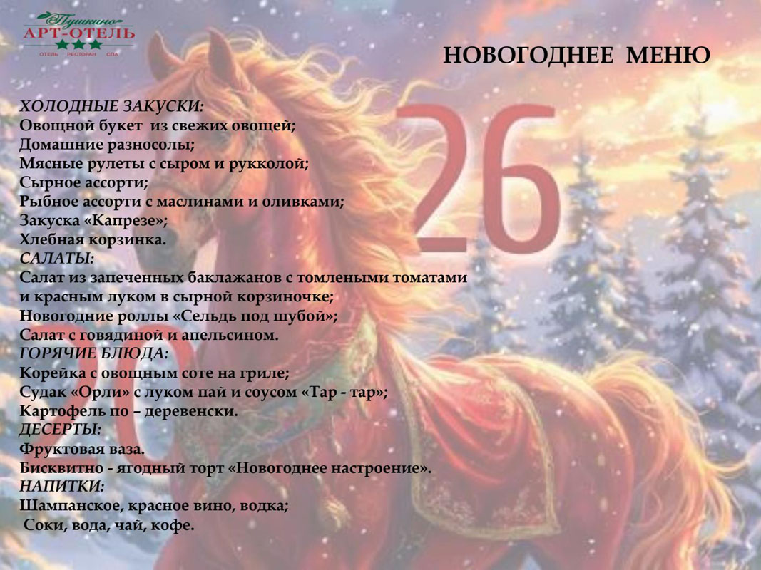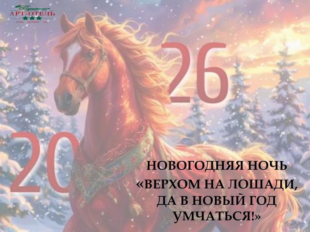 Новогодняя программа «ВЕРХОМ НА ЛОШАДИ, ДА В НОВЫЙ ГОД УМЧАТЬСЯ!» с новогодним банкетом.