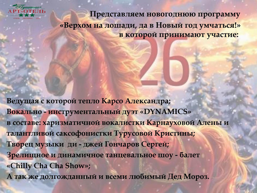 Мы приглашаем вас в зимнюю сказку Подмосковья, где, забыв о городской суете, вы будете ЗАЖИГАТЬ НОВЫЙ ГОД КРАСНОЙ ОГНЕННОЙ ЛОШАДИ!